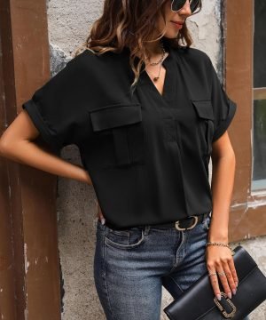 Women Chiffon Button Down Shirts with Pocket Short Sleeve Office Blouses V Neck Casual Business Tops Slim Fit Shirts