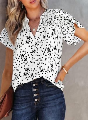 Women’s Casual V Neck Floral Print Smocked Short Sleeve Chiffon Blouses Bohemian Top Shirts