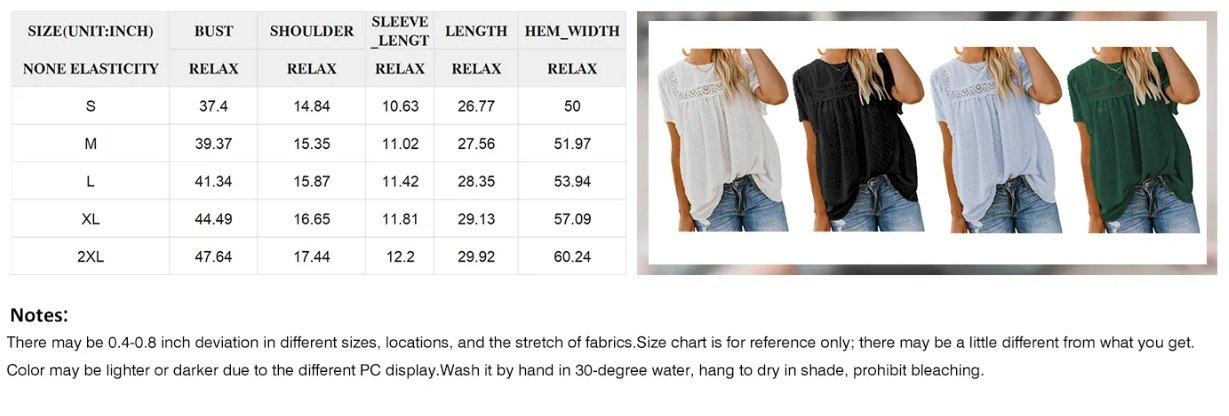 Sexy Lace Round Neck Short Sleeve Blouses The fashion tops is comfortable to wear in spring, summer, fall and winter Casual Summer Loose Solid Chiffon Blouse You can pair it with shorts, skirts, jeans, sneakers, heels and so on Fashion Lace Crochet Pom Pom Boho Shirts Perfect choice for your daily wear, outdoor activities, party, date and any other occasions Reviews There are no reviews yet. Be the first to review “Womens Crewneck Lace Crochet Pom Pom Flowy Short Sleeve Casual Shirts Blouses Tops”Cancel ReplyYour email address will not be published. Required fields are marked *Your rating * Rate… Perfect Good Average Not that bad Very poor Name *Email *Your review *Submit