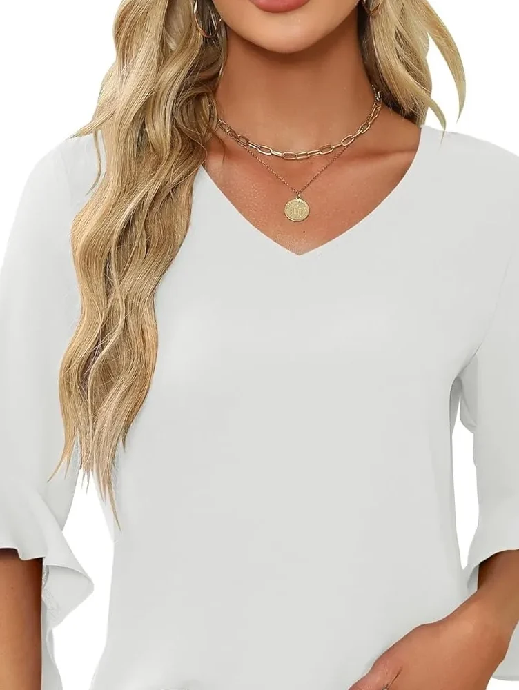Design Elements: Look for blouses with thoughtful design features such as ruffles, which add texture and visual interest. A V-neckline can enhance your silhouette and draw attention to your collarbone, creating a flattering look. Additionally, consider the sleeve length; 3/4 sleeves are a great option for versatility, offering coverage while still being suitable for warmer weather.